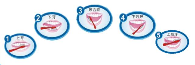 ☆ 進(jìn)食后或睡覺前,用軟毛牙刷按下圖的順序輕柔刷牙,動作一定要慢而緩,只要沿著牙縫將殘留食物和牙垢刷去即可。