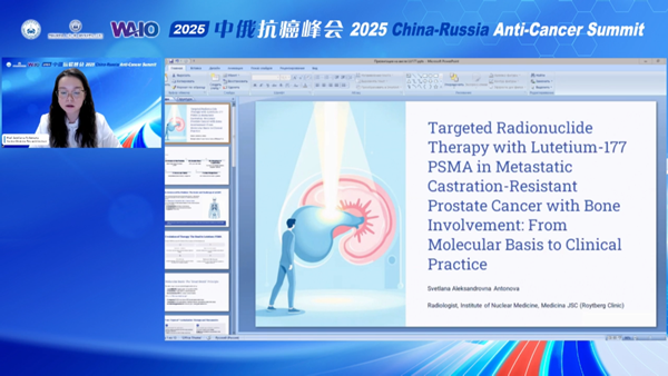 俄羅斯科學(xué)院院士、俄羅斯國(guó)立N. I. Pirogov醫(yī)科大學(xué)家庭醫(yī)學(xué)系主任、俄羅斯聯(lián)邦功勛醫(yī)生Grigory Roytberg院士的講座報(bào)告為“針對(duì)伴有骨轉(zhuǎn)移的轉(zhuǎn)移性去勢(shì)抵抗性前列腺癌的Lutetium-177 PSMA靶向放射性核素治療:從分子基礎(chǔ)到臨床實(shí)踐”。本次講座由核醫(yī)學(xué)研究所醫(yī)生Svetlana Antonova教授進(jìn)行分享,講座中Antonova教授指出,約90%的前列腺癌患者會(huì)發(fā)生骨轉(zhuǎn)移,嚴(yán)重影響生活質(zhì)量,并分享了該領(lǐng)域最新進(jìn)展——Lutetium-177放射性配體療法。該方法針對(duì)前列腺癌骨轉(zhuǎn)移問(wèn)題,通過(guò)嚴(yán)格患者篩選(基于PSMA PET-CT)、療效評(píng)估及毒性管理實(shí)現(xiàn)高效治療。結(jié)果顯示,患者總生存期提升至15.3個(gè)月,死亡風(fēng)險(xiǎn)下降38%,骨痛顯著減輕,且藥物毒性可控。未來(lái),Lutetium-177 有望與免疫治療等聯(lián)合,為前列腺癌患者提供更有效的治療選擇。