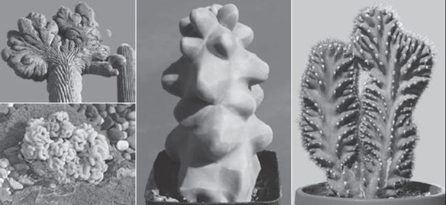 很多年前,我在亞利桑那州第一次看到鳳頭仙人掌時(shí),就被它美麗的幾何構(gòu)造吸引住了?;氐骄频曛螅一藥讉€(gè)小時(shí)的時(shí)間觀賞這些自然生物構(gòu)造的照片,并閱讀了它們的相關(guān)資料。我了解到,變異鳳頭仙人掌的生長(zhǎng)模式被打亂的原因,有時(shí)是暴風(fēng)雨造成的破壞,有時(shí)是細(xì)菌或病毒感染,有時(shí)是其生長(zhǎng)過(guò)程中發(fā)生的遺傳突變。
